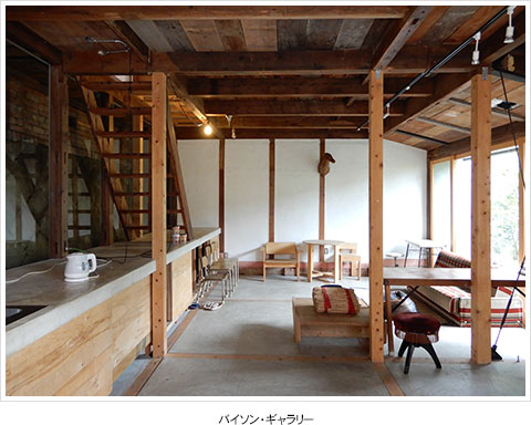 購入した建物のほとんどが道路に面しています。ブロック塀などを取り払って、全体的な繋がりを持たせるようにしています。ちなみに最初に購入した廃屋は、バイソン全体のギャラリー兼シェアオフィスとして使っています。モデルルームの解体材を貰ってきたり廃業した材木店から処分材を貰ってくるなどして、様々な廃材を再利用しています。実際、バイソン・ギャラリーのガラスはマンションのモデルルームで使っていた物ですし、棚の扉は梱包材に使われていたロシア産バーチです。こちらは舞子に行ってもらってきました。