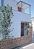 塀は高いがバルコニー手摺とデザインを統一。すっきりとした印象を与える