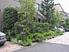 2段植栽により、生垣手前の部分は通りに見せる植栽となっている。オープンなつくりは通りを広く見せる