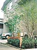 道路側の室外機手前を丹念に植栽している。中高木によって緑量が多く見え、建物の印象をよくしている