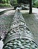水路との境界にあたるが、丸い瓦と石を使うことで曲線をさらにやわらかにつくり出している |