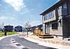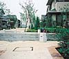 宅地内の道路と歩行者専用道路との交差地点。街区の表示も兼ねて舗装材を変化させ、楽しい空間につくられている |
