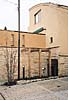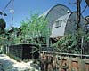 建物壁面の金属素材と特徴的な形が際立っているが外構の塀の個性的な素材との調和を見せている(塀は板と石とレンガの組み合わせ)