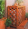 室外機を隠すトレリス※注:室外機の廃熱効果を妨げないよう設計する。また、ファン前面に塀等がある場合、室外機の機種、塀の高さによって離すべき距離が決められている