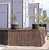 枕木を利用した素材の意外性があり面白い。コンテナの植栽も合わせデザイン意図が感じられる