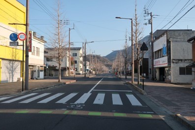 善通寺駅から西にまっすぐ伸びる片原町通りは、同師団が設置された際に整備された、駐屯地と善通寺駅を結ぶ幹線道路です。大規模な軍事輸送に耐えうるよう、一般的な町道よりも広い幅員で整備されています(柴田、2004)。他にも広幅員の直線的な道路が整備されており、特に善通寺から南に伸びるゆうゆうロードは、幅員と通行量のアンバランスが際立っていました(写真2)。