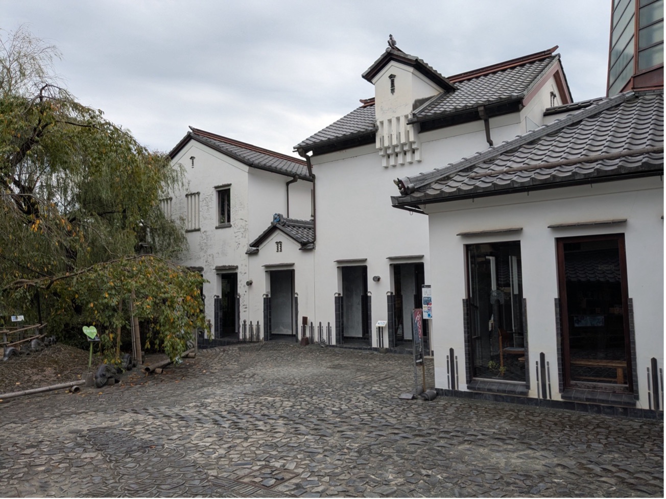 全長 4.75 km、幅員約 15 m のこの水路は、天正13年(1585年)、豊臣秀次が八幡山に城を築き開町したことに始まります。琵琶湖と城下町を結ぶ水運路として整備され、湖上を往来する船を城下内に寄港させることで人・物・情報を集める機能を担いました[3]。城を守る軍事的役割を担うとともに、物流を支える水運の役割も備えた、重要なインフラでした。 堀沿いの側道を歩いていると、石垣の上に白壁の土蔵や旧家が立ち並んでおり、まるで時代を遡ったかのような感覚を覚えます(写真2)。今日では飲食店やカフェとして再活用されているものも多く、築 170 年の土蔵を改装したカフェや、堀沿いにテラスを設けた食事処なども見られました。外観は当時の町並みの雰囲気を保ちながら、内部は現代の利用に合わせて改修されており、歴史的景観と現在の暮らしが共存する町並みの魅力を感じることができました。