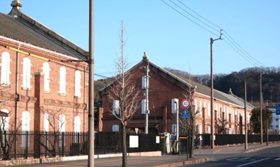 そのゆうゆうロードを南に歩くと、左手に並ぶ赤レンガの建物群が見えてきます。同師団の兵器庫として整備された建物で、今も陸上自衛隊善通寺駐屯地倉庫として使われています。屋根は切妻造の瓦葺きで、縦長の窓があり、花こう岩のひさし台と鉄製の両開き扉が特徴です。各棟の幅が60mを超える赤レンガ倉庫群は、門前の木造建築のスケールとは異なる存在感を放っています(写真3)。