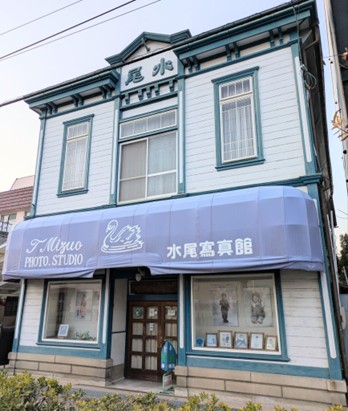 駅から善通寺に向かって少し歩くと、国指定登録有形文化財の旧瀬川酒店があります(写真5)。母屋は本瓦葺き入母屋造りの建物(1917年)で、日露戦争凱旋のときに初代師団長の乃木希典がたいそうほめた酒を、「師団一」と名前をつけ販売していました。さらに進むと、レトロな洋風建築(1920年代)で現在も営業を続ける水尾写真館があります(写真6)。木造二階建ての寄棟造、外壁は白く塗った下見板張りで、軒下や柱など随所に施された装飾が優雅な雰囲気を醸しています。