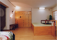 ・上肢、手指の力が弱いので、電動で上下する堀コタツとタタミ収納を設置しました。コタツにはタタミを置いて客間にもなります。